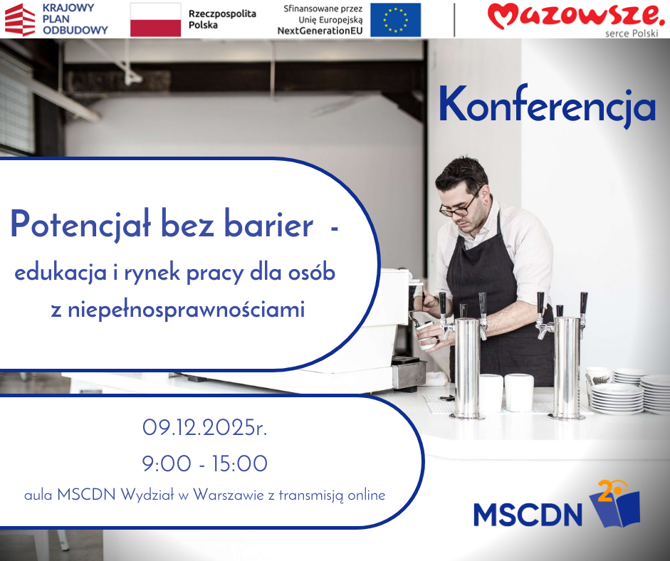 Szanowni Państwo Dyrektorzy, Nauczyciele, Rodzice – zapraszamy do udziału w konferencji, której tematem jest: „Potencjał bez Barier – Edukacja i Rynek Pracy dla Osób z Niepełnosprawnościami”, która odbędzie się 9 grudnia 2025 r. stacjonarnie w MSCDN, ul. Świętojerska 9, Warszawa oraz ONLINE.