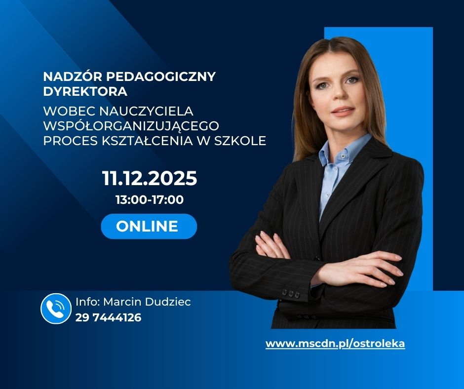 Udział w tej konferencji pozwoli Państwu usprawnić nadzór pedagogiczny oraz efektywnie organizować współpracę z nauczycielem współorganizującym proces kształcenia. Podczas spotkania „Nadzór pedagogiczny dyrektora wobec nauczyciela współorganizującego proces kształcenia w szkole” dr Emilia Wojdyła przekaże dyrektorom i zainteresowanym nauczycielom aktualną, praktyczną wiedzę, zgodną z obowiązującymi przepisami. Prelegentka to znawca prawa oświatowego, doświadczony pracownik JST, organów nadzoru pedagogicznego, MEN oraz dyrektor szkoły w Warszawie. Szkolenie jest bezpłatne, dostępne ONLINE — bez konieczności opuszczania placówki. Zapraszamy serdecznie 11 grudnia 2025 r. w godz. 13:00 – 17:00 i zachęcamy do zapisów poprzez poniższy link: https://system.mscdn.pl/zewnetrzne/zgloszenie/id/29810/o/-2/w/Ostro%C5%82%C4%99ka