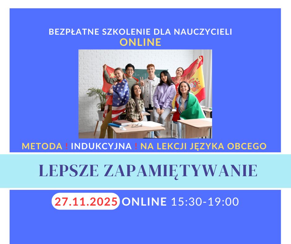 Chcesz, aby Twoi uczniowie lepiej zapamiętywali materiał oraz uczyli się języka w sposób bardziej świadomy, samodzielny i angażujący? Metoda indukcyjna pozwala uczniom odkrywać reguły językowe samodzielnie, co nie tylko wzmacnia ich poczucie sprawczości, ale także znacząco poprawia trwałość przyswajania wiedzy. Jeśli chcesz rozwijać warsztat, poszerzać perspektywę i tworzyć lekcje, które naprawdę angażują uczniów, zapisz się na BEZPŁATNE szkolenie ONLINE „Metoda indukcyjna w rozwijaniu u uczniów świadomości językowej”, które odbędą się 27.11.2025 r. w godz. 15:30-19:00. Link do zapisów: https://system.mscdn.pl/zewnetrzne/zgloszenie/id/29423/o/-2/w/Ostro%C5%82%C4%99ka