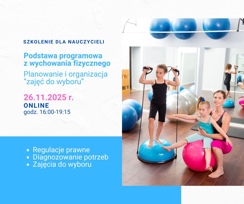 Nauczycielu wychowania fizycznego, chcesz zwiększyć aktywność uczniów oraz uatrakcyjnić zajęcia? Przygotowaliśmy dla Ciebie bezpłatne szkolenie ONLINE „Podstawa programowa z wychowania fizycznego – planowanie i organizacja zajęć do wyboru”. Na webinarze omówimy regulacje prawne i najważniejsze zapisy podstawy programowej wychowania fizycznego oraz wskażemy, jak badać preferencje i możliwości młodzieży, by zajęcia były atrakcyjne i rozwijające. Uczestnicy otrzymają praktyczne wskazówki, jak tworzyć ofertę, harmonogram i dokumentację zgodnie z przepisami i dobrymi praktykami. Szkolenie poprowadzi Barbara Chełmińska – doradca metodyczny w zakresie wychowania fizycznego MSCDN. Zapraszamy 26 listopada 2025 r. w godzinach 16:00–19:15. Zapisz się już dziś: https://system.mscdn.pl/zewnetrzne/zgloszenie/id/29809/o/-2/w/Ostro%C5%82%C4%99ka