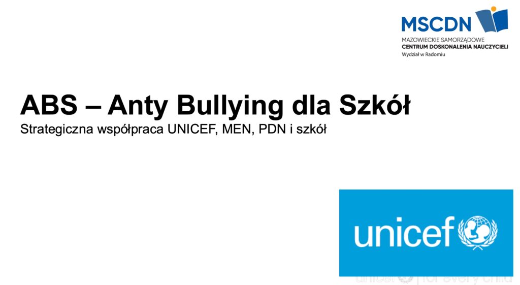 Opis projektu Program ABS – Anty-Bullying dla Szkół to pilotażowy projekt realizowany we współpracy z Ministerstwem Edukacji Narodowej oraz UNICEF. Jego zadaniem jest opracowanie i przetestowanie skutecznych strategii przeciwdziałania przemocy rówieśniczej w polskich szkołach. Projekt przebiega we współpracy z uczniami, rodzicami, nauczycielami oraz instytucjami wspierającymi edukację, aby proponowane rozwiązania były adekwatne do realnych potrzeb środowiska szkolnego.Pilotaż realizowany jest w wybranych placówkach z całej Polski, w tym w PSP im. Teresy Grodzińskiej w Bielisze w gminie Zakrzew. Obejmuje etap testowania narzędzi i metod, które posłużą do stworzenia krajowego pakietu materiałów, procedur i wskazówek wdrożeniowych. Jednym z 20 ekspertów zaproszonych do udziału w projekcie jest konsultant ds. wsparcia psychologiczno-pedagogicznego z MSCDN w Radomiu, wspierający proces opracowywania i testowania rozwiązań.Pilotaż zakończy się w roku szkolnym 2025/2026, a jego wyniki zostaną poddane szczegółowej ewaluacji i podsumowane podczas ogólnopolskiej konferencji. Cel:Celem programu ABS jest opracowanie systemowych, skutecznych oraz możliwych do wdrożenia w całej Polsce strategii przeciwdziałania przemocy rówieśniczej. Program wspiera szkoły w budowaniu bezpiecznego i włączającego środowiska sprzyjającego zdrowiu psychicznemu uczniów, zgodnego ze Standardami Ochrony Małoletnich oraz priorytetami MEN. Model działania Model działania projektu opiera się na kilku kluczowych elementach: Profilaktyka przemocy rówieśniczej jako podstawowy obszar interwencji. Szkolenia i wsparcie dla rad pedagogicznych, nastawione na rozpoznawanie, reagowanie oraz zapobieganie przemocy. Tworzenie i testowanie strategii anty-bullyingowych dostosowanych do specyfiki i potrzeb poszczególnych szkół. Aktywne zaangażowanie uczniów i rodziców w proces planowania i podejmowania decyzji. Rozwijanie współpracy między szkołami, poradniami oraz ośrodkami doskonalenia nauczycieli, by budować spójny system profilaktyki i wsparcia. Ewaluacja efektów pilotażu oraz wykorzystanie jej wyników przy opracowywaniu finalnego programu ogólnopolskiego.Pilotaż stanowi istotny etap w kierunku stworzenia kompleksowego, trwałego i opartego na dowodach programu antyprzemocowego w polskiej edukacji, rekomendowanego przez Ministerstwo Edukacji Narodowej. Osoba odpowiedzialna za realizację projektu: Ewa Banach ewa.banach@mscdn.edu.pl