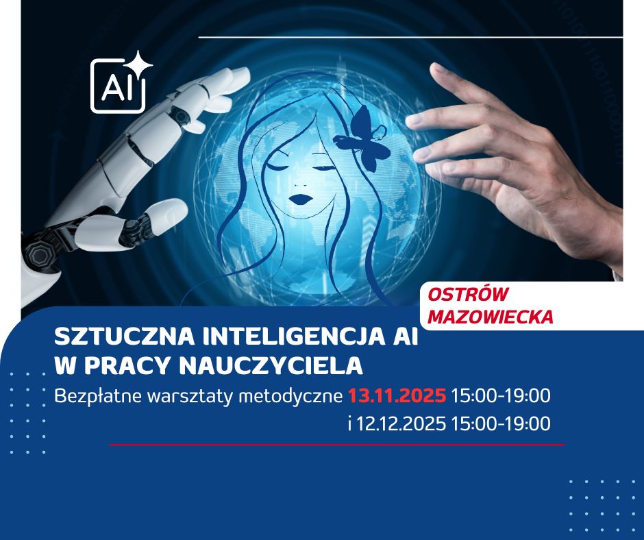 Dla nauczycieli, którzy chcą zgłębić tajniki i poznać nowinki związane z narzędziami sztucznej inteligencji, organizujemy warsztaty metodyczne w Ostrowi Mazowieckiej. Szkolenie obejmuje: 1. Wprowadzenie do tematu sztucznej inteligencji w edukacji. 2. Narzędzia i aplikacje AI w edukacji. 3. Wykorzystanie AI w procesie nauczania i uczenia się. Warsztaty odbędą się hybrydowo 13.11.2025 r. w godz. 15:00-19:00 i 12.12.2025 r. Zapraszamy do Muzeum Dom Rodziny Pileckich w Ostrowi Mazowieckiej. Zapisy: https://system.mscdn.pl/zewnetrzne/zgloszenie/id/29403/o/-2/w/Ostro%C5%82%C4%99ka