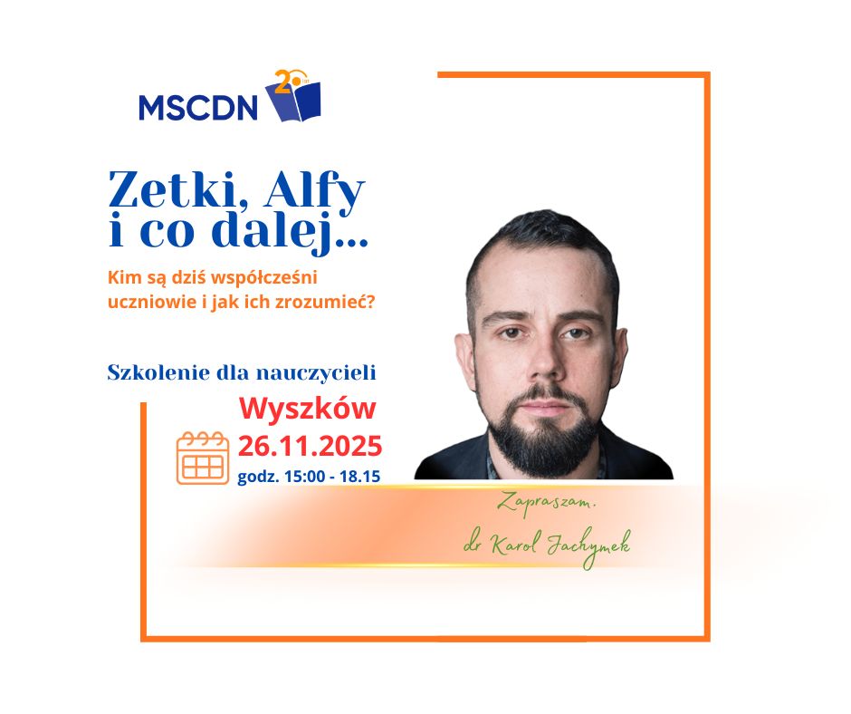 Czy Zetki są roszczeniowe, a Alfy uzależnione od smartfonów? Z jakimi problemami mierzą się najmłodsze pokolenia? Bezpłatne szkolenie dla nauczycieli „Zetki, Alfy i co dalej…Kim są dziś współcześni uczniowie i jak ich zrozumieć?” poprowadzi dr Karol Jachymek – kulturoznawca, medioznawca, twórca cyfrowy, doktor nauk humanistycznych, adiunkt w Katedrze Kultury i Mediów na Wydziale Nauk Humanistycznych Uniwersytetu SWPS w Warszawie. Dr Jachymek specjalizuje się w kulturze młodzieżowej. Zapraszamy 26.11.2025 r. w godz. 15:00-18.15 do Centrum Kształcenia Ustawicznego w Wyszkowie przy ul. Jana Matejki 9 Każdy uczestnik otrzyma zaświadczenie. Zapisy: https://system.mscdn.pl/zewnetrzne/zgloszenie/id/29787/o/-2/w/Ostro%C5%82%C4%99ka