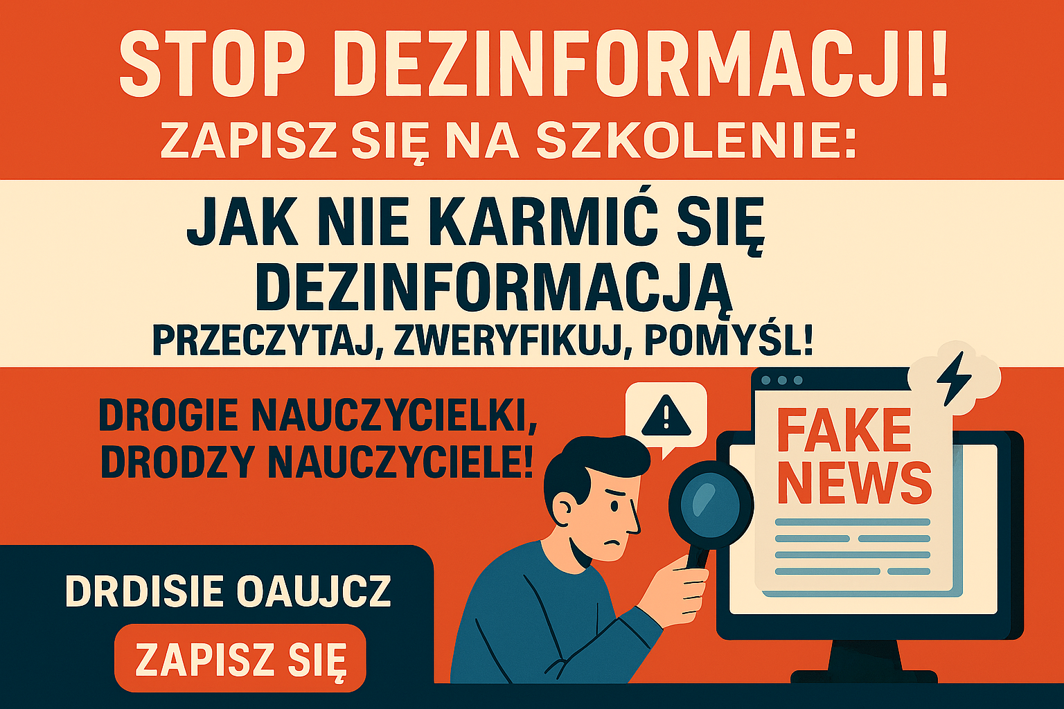 Szkolenie: Jak nie karmić się dezinformacją – przeczytaj, zweryfikuj, pomyśl! Szanowne Nauczycielki, Szanowni Nauczyciele, Czy zdarza się Państwu czuć zagubienie w natłoku informacji? Czy chcieliby Państwo nauczyć się, jak skutecznie odróżniać prawdę od fałszu oraz chronić siebie i swoich uczniów przed dezinformacją? Zapraszamy serdecznie do udziału w praktycznym szkoleniu w formule hybrydowej: „Jak nie karmić się dezinformacją – przeczytaj, zweryfikuj, pomyśl!” To kluczowy krok w rozwijaniu kompetencji krytycznego myślenia w erze cyfrowej. Uczestnicy szkolenia zdobędą wiedzę i narzędzia, które pomogą wspierać uczniów w budowaniu świadomości medialnej. Harmonogram i forma szkolenia Szkolenie odbędzie się w dwóch częściach: Część stacjonarna23 października (wtorek), godz. 16:00–19:00MSCDN, ul. Kościuszki 5a, sala 220 Część zdalna12 listopada (środa)Platforma: MS Teams Program szkolenia – trzy kluczowe moduły Jak zdemaskować niewidzialnego przeciwnika?Uczestnicy poznają mechanizmy powstawania i rozprzestrzeniania fake newsów, manipulacji oraz teorii spiskowych. Nauczą się je rozpoznawać i przeciwdziałać ich wpływowi. Słowa mają moc – krytyczne myślenie i edukacja medialnaModuł poświęcony rozwijaniu umiejętności krytycznego myślenia. Uczestnicy zdobędą praktyczne narzędzia do weryfikacji źródeł informacji oraz poznają metody wprowadzania edukacji medialnej do pracy z uczniami. Czy trzeba bać się sztucznej inteligencji?Omówione zostaną zagrożenia i możliwości związane z wykorzystaniem sztucznej inteligencji w edukacji. Uczestnicy dowiedzą się, jak świadomie i bezpiecznie korzystać z nowych technologii. Zapisy Formularz zgłoszeniowy dostępny jest pod adresem:https://mscdn.pl/szkolenia-mscdn-wydzial-w-radomiu/ Liczba miejsc jest ograniczona – zachęcamy do szybkiej rejestracji. Kontakt Maria Trzos – nauczyciel konsultant w zakresie edukacji historycznej i obywatelskieje-mail: maria.trzos@mscdn.edu.pltel. 48 362 98 72 Zapisz się już dziś i zdobądź kompetencje niezbędne w świecie pełnym informacji!