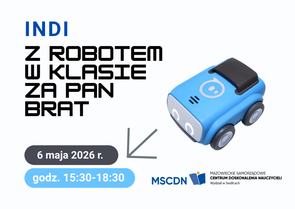 Chcesz wprowadzić swoich uczniów w świat nowoczesnych technologii i rozwijać ich kompetencje przyszłości? Dołącz do inspirującego szkolenia, podczas którego poznasz możliwości pracy z wyjątkowym robotem edukacyjnym INDI! 📅 Kiedy? 6 maja 2026 r. (15:30–18:30)📍 Gdzie? MSCDN Wydział w Siedlcach Dlaczego warto? To praktyczne szkolenie w duchu STEAM pomoże Ci:✔ rozwijać myślenie analityczne uczniów✔ wzbogacić zajęcia o nowoczesne narzędzia edukacyjne✔ wprowadzić podstawy programowania w sposób atrakcyjny i angażujący✔ wykorzystać robota INDI w codziennej pracy dydaktycznej W programie: 🔹 Robotyka w podstawie programowej I etapu edukacyjnego🔹 Podstawowe właściwości technologiczne robota INDI🔹 Tryby pracy i programowanie robota INDI🔹 Nauka programowania z wykorzystaniem robota INDI Formularz zgłoszeniowy