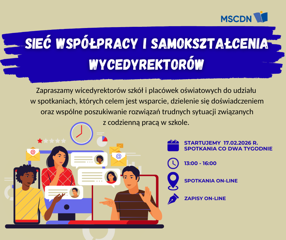 Zapraszamy wicedyrektorów szkół i placówek oświatowych do udziału w „Sieci współpracy i samokształcenia wicedyrektorów”, której celem jest dzielenie się doświadczeniem oraz wspólne poszukiwanie rozwiązań i trudnych sytuacji związanych z codzienną pracą w szkole. Tematyka spotkań dotyczyć będzie praktycznego podejścia do zagadnień: Terminy spotkań: 17.02.2026, 3.03.2026, 17.03.2026, 31.03.026, 14.04.2026, 28.04.2026, 5.05.206, 19.05.2026 w godzinach: 13:00 – 16:00. Zapisy: https://system.mscdn.pl/zewnetrzne/zgloszenie/id/29604/o//w/Warszawa Osoby do kontaktu: