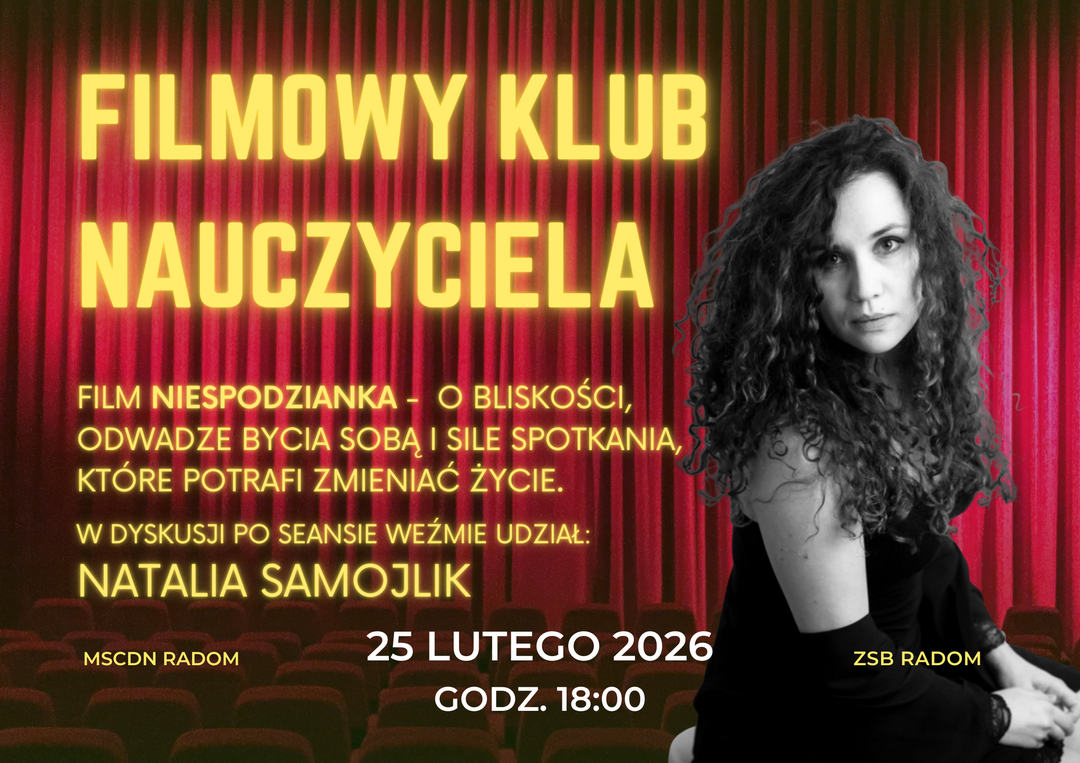 Zapraszamy na kolejny wieczór w ramach Filmowego Klubu Nauczyciela – przestrzeń spotkania z kinem, które porusza emocje, skłania do refleksji i zachęca do rozmowy o tym, co naprawdę ważne w relacjach międzyludzkich. Prezentowany film, którego tytuł pozostaje jak zwykle niespodzianką, podejmuje temat bliskości, odwagi podążania za własnymi pragnieniami oraz siły spotkania z drugim człowiekiem, które potrafi zmieniać sposób patrzenia na świat i wspólnotę. To opowieść subtelna, pełna czułości i uważności na codzienność, a zarazem otwierająca przestrzeń do głębszej refleksji nad wartościami obecnymi w naszym życiu.