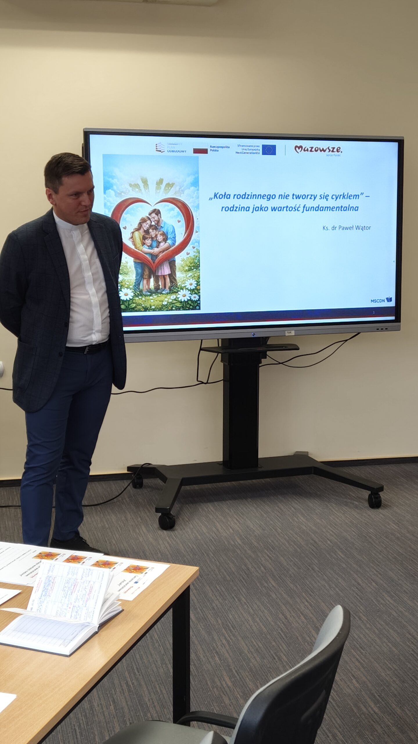 26.03.2026 r. w MSCDN Wydział w Ostrołęce odbyły się warsztaty metodyczne „Koła rodzinnego nie tworzy się cyrklem” – rodzina jako wartość fundamentalna. Celem warsztatów było ukazanie roli i znaczenia rodziny jako wartości priorytetowej w życiu każdego człowieka. Prowadzący skupił się na czterech zagadnieniach związanych z modułami warsztatów: jak być powinno; jak jest – o kryzysie rodziny XXI w.; dlaczego nie jest tak, jak być powinno; jak przywrócić rodzinie wartość fundamentalną. Uczestnicy w grupach wykonywali ćwiczenia warsztatowe: „mapę wartości rodziny, analizowali studium przypadku dotyczące potrzeb dziecka, rodzica, relacji w rodzinie. Szkolenie przebiegło w atmosferze twórczej pracy, uczestnicy wykazali duże zainteresowanie poruszanymi zagadnieniami, zadawali pytania, dzielili się doświadczeniami. Wydarzenie zostało dofinansowane w ramach projektu „Zbudowanie systemu koordynacji i monitorowania regionalnych działań na rzecz kształcenia zawodowego, szkolnictwa wyższego oraz uczenia się przez całe życie, w tym uczenia się dorosłych” współfinansowany ze środków Krajowego Planu Odbudowy, zgodnie z umową o objęcie projektu wsparciem z planu rozwojowego nr: KPO/22/LLL/U/0011.