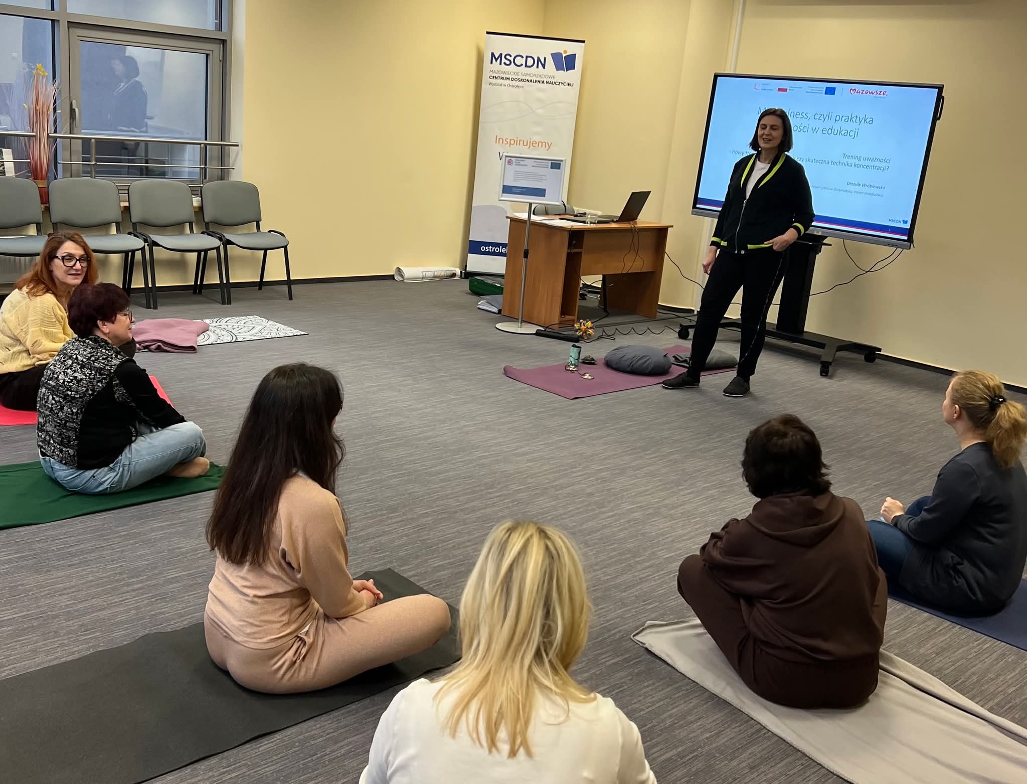 12 i 13 lutego 2026 r. w MSCDN Wydział w Ostrołęce odbyły się warsztaty metodyczne „Mindfulness, czyli praktyka uważności w edukacji” prowadzone przez dr hab. Urszulę Wróblewską prof. Uniwersytetu w Białymstoku – certyfikowaną trenerkę mindfulness. Udział w nich wzięli psycholodzy, pedagodzy, pedagodzy specjalni, nauczyciele przedmiotów. Nauczyciele doskonalili kompetencje w zakresie projektowania i wdrażania działań ogólnoszkolnych z wykorzystaniem technik mindfulness, wspierających dobrostan uczniów i nauczycieli. Program obejmował wprowadzenie do treningu uważności oraz prezentację praktycznych ćwiczeń możliwych do zastosowania w codziennej pracy dydaktycznej i wychowawczej. Istotnym elementem szkolenia były zajęcia praktyczne „tu i teraz” z instruktażem dostosowania technik do potrzeb i warunków funkcjonowania szkoły.