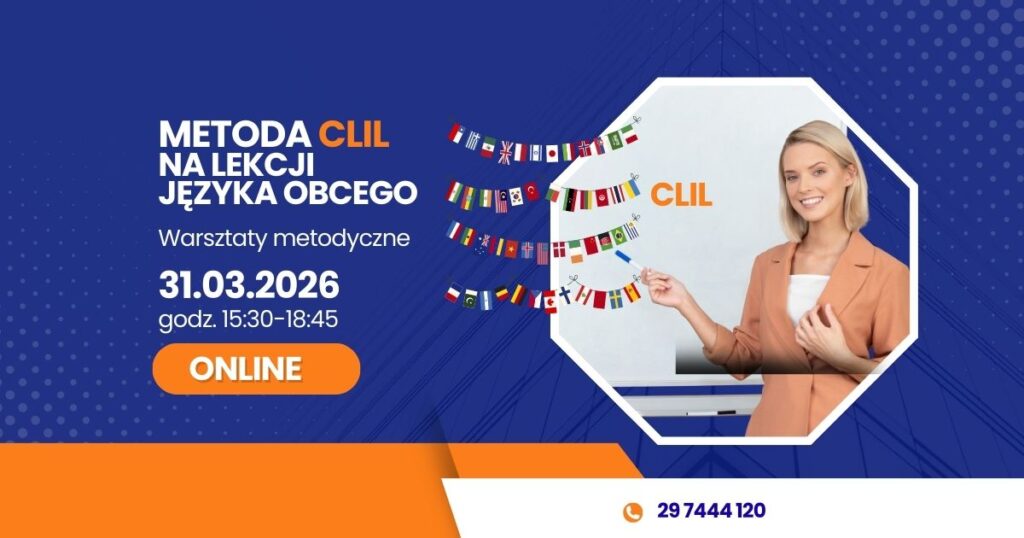 jeśli chcesz, aby Twoje lekcje językowe były bardziej angażujące, praktyczne i zapadające w pamięć uczniów, skorzystaj z bezpłatnego szkolenia ONLINE „Metoda CLIL na lekcji języka obcego – sposób na wzmocnienie motywacji ucznia”.