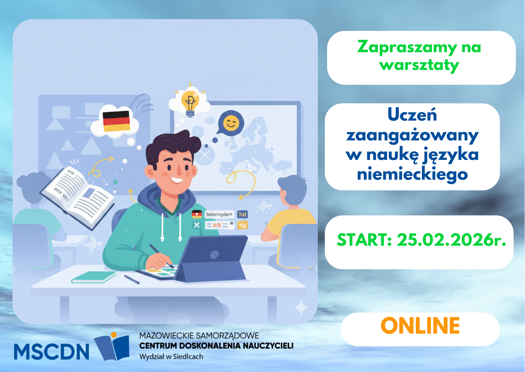 Zapraszamy 25.02.2026 na szkolenie dedykowane nauczycielom, którzy szukają sprawdzonych sposobów na aktywizację swoich uczniów. Warsztaty „Uczeń zaangażowany w naukę języka niemieckiego” to solidna dawka wiedzy podzielona na 4 moduły: