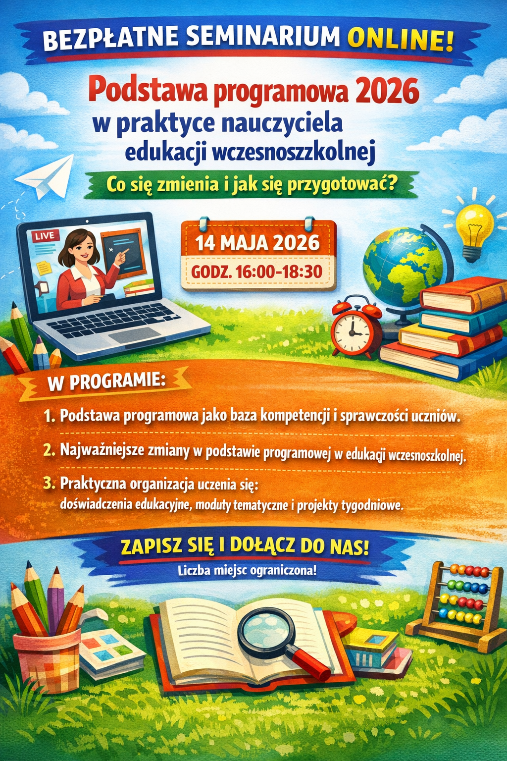 NAUCZYCIELI EDUKACJI WCZESNOSZKOLNEJ oraz inne osoby zainteresowane tematyką zachęcamy do udziału w szkoleniu ONLINE „Podstawa programowa 2026 w praktyce nauczyciela edukacji wczesnoszkolnej – co się zmienia i jak się przygotować?”