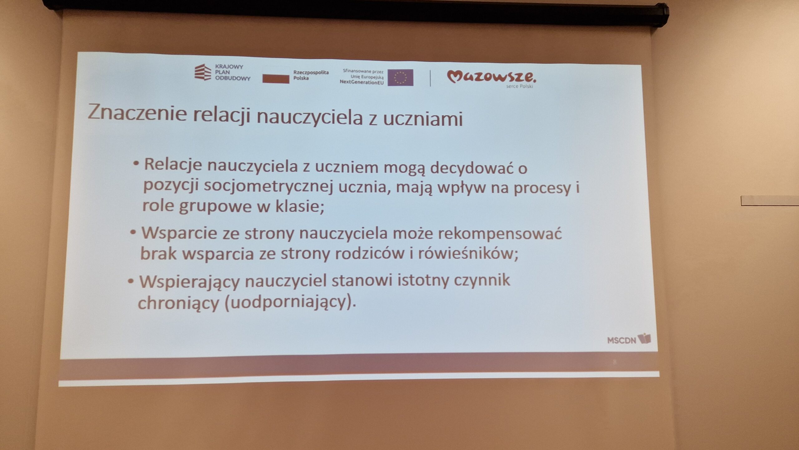 Treści warsztatów metodycznych „Prowokacyjne zachowania uczniów – skuteczne sposoby reagowania”, zrealizowanych w ostrołęckim Wydziale MSCDN, poruszały zagadnienia związane z radzeniem sobie z wyzwaniami wychowawczymi oraz ze wzmacnianiem społecznej funkcji szkoły. Szkolenie promowało podejście oparte na edukacji włączającej oraz rozwiązywaniu konfliktów bez użycia przemocy, co jest kluczowym elementem dbałości o wysoką jakość relacji w szkole. Uczestnikami warsztatów byli nauczyciele różnych typów szkół, uczący różnych przedmiotów oraz psychologowie, pedagodzy szkolni i nauczyciele wspomagający.