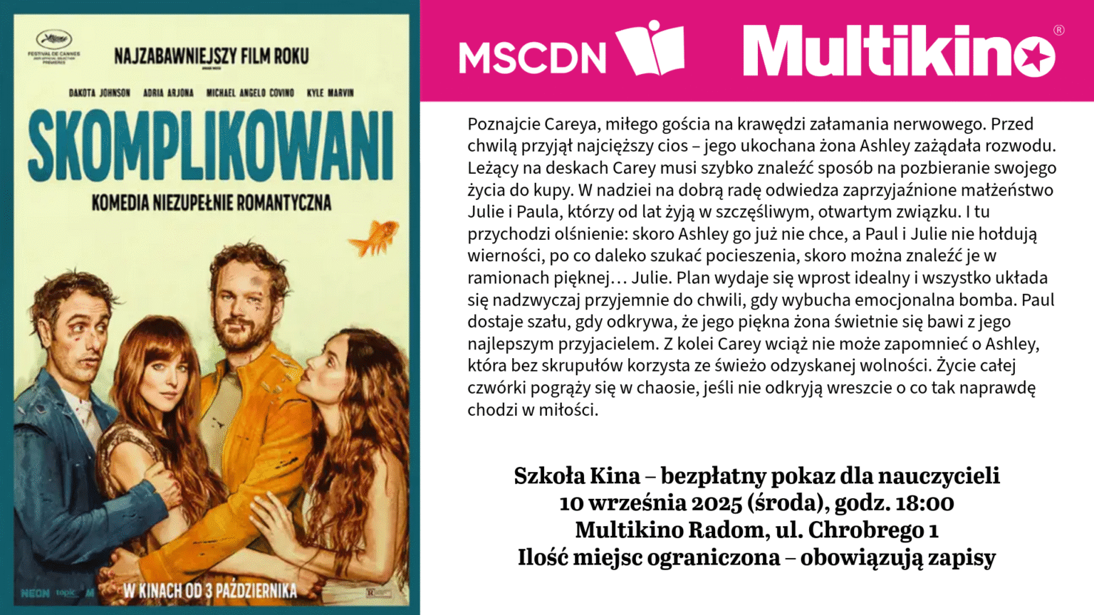 Mazowieckie Samorządowe Centrum Doskonalenia Nauczycieli Wydział w Radomiu, wspólnie z Multikinem Radom (ul. Chrobrego 1), zaprasza nauczycieli i dyrektorów szkół na pierwszy w nowym roku szkolnym pokaz w ramach Szkoły Kina.