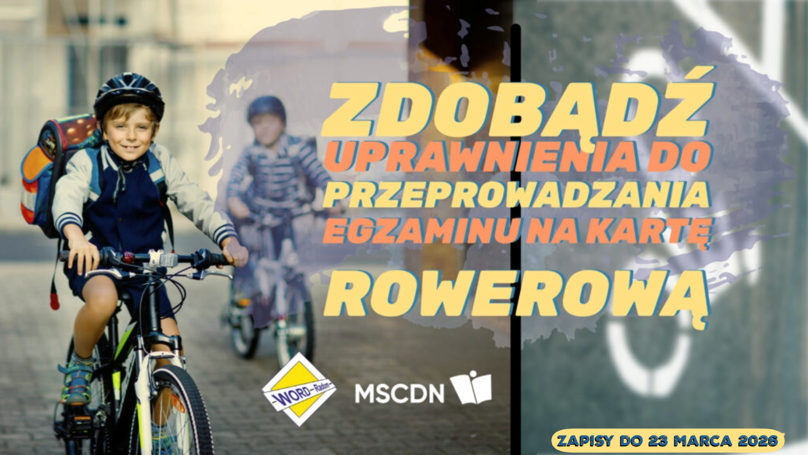 Zapraszamy nauczycieli szkół podstawowych na specjalistyczne szkolenie w zakresie ruchu drogowego uprawniające do przeprowadzania egzaminu na kartę rowerową. Organizatorem szkolenia jest Mazowieckie Samorządowe Centrum Doskonalenia Nauczycieli oraz Wojewódzki Ośrodek Ruchu Drogowego w Radomiu. Celem szkolenia jest zapewnienie koniecznych kwalifikacji osobom prowadzącym zajęcia szkolne, jak również wzbogacenie i uaktualnienie wiedzy nauczycieli z zakresu przepisów ruchu drogowego, ze szczególnym uwzględnieniem ruchu rowerowego. Szkolenie odbędzie się stacjonarnie 24 marca 2026 roku, w godzinach: 15.00 – 19.45 w siedzibie MSCDN w Radomiu ul. T. Kościuszki 5a.