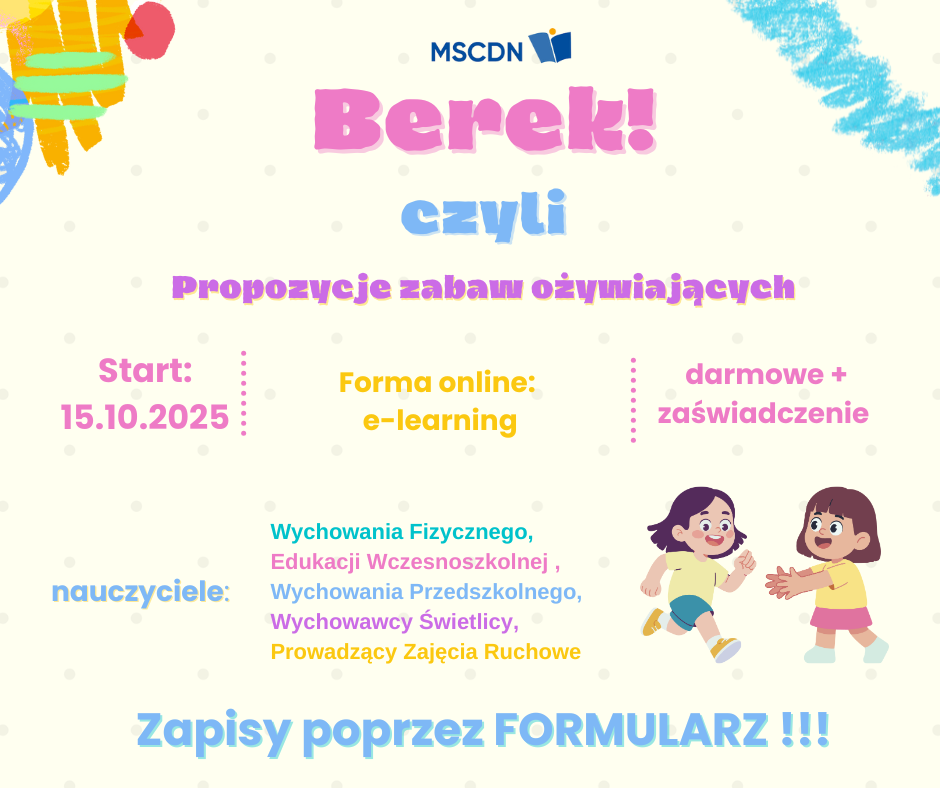 Zapraszamy na szkolenie online „Berek! … czyli propozycje zabaw ożywiających na lekcjach wychowania fizycznego.” Szkolenie przeznaczone jest dla nauczycieli: – wychowania fizycznego, – edukacji wczesnoszkolnej, – wychowania przedszkolnego, – wychowawców świetlicy, – instruktorów, trenerów, prowadzących zajęcia ruchowe. Szkolenie ma charakter samokształceniowy i będzie realizowane na platformie e-learningowej Moodle. Obowiązuje zapis przez FORMULARZ ZGŁOSZENIOWY Uwaga! – Rozpoczęcie – 15.10.2025 r. – Koszt – bezpłatne – Zaświadczenie – TAK Serdecznie zapraszamy!
