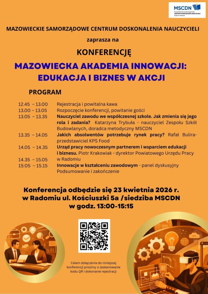 Szanowni Państwo Dyrektorzy, Doradcy Zawodowi, Nauczyciele i Wychowawcy, serdecznie zapraszamy na konferencję pt. „Mazowiecka Akademia Innowacji: Edukacja i Biznes w akcji”, która odbędzie się 23 kwietnia 2026 r. w godzinach 13:00–15:15 w siedzibie MSCDN Wydział w Radomiu (ul. Kościuszki 5a). Konferencja wpisuje się w realizację głównych kierunków polityki oświatowej państwa w zakresie promocji kształcenia zawodowego w szkołach podstawowych oraz wzmocnienia roli doradztwa zawodowego. W programie przewidziano: inspirujące wystąpienia, przykłady efektywnej współpracy edukacji z biznesem, prezentację kształcenia branżowego, omówienie przygotowania młodzieży do wymagań współczesnego rynku pracy, nowoczesne rozwiązania technologiczne wspierające doradztwo zawodowe. Zarówno doradcom zawodowym, jak i nauczycielom oraz wychowawcom (szczególnie klas VII i VIII szkół podstawowych oraz szkół ogólnokształcących) chcemy zaprezentować przykład nowoczesnego, innowacyjnego kształcenia zawodowego, który może stać się inspiracją do rozmów o wyborach edukacyjno-zawodowych uczniów. Zapisy na konferencję dostępne są pod linkiem:https://system.mscdn.pl/zewnetrzne/zgloszenie/id/30882/o//w/Radom Szczegółowych informacji udziela kierownik formy:Elżbieta Małeke-mail: elzbieta.malek@mscdn.edu.pl Serdecznie zapraszamy do udziału!