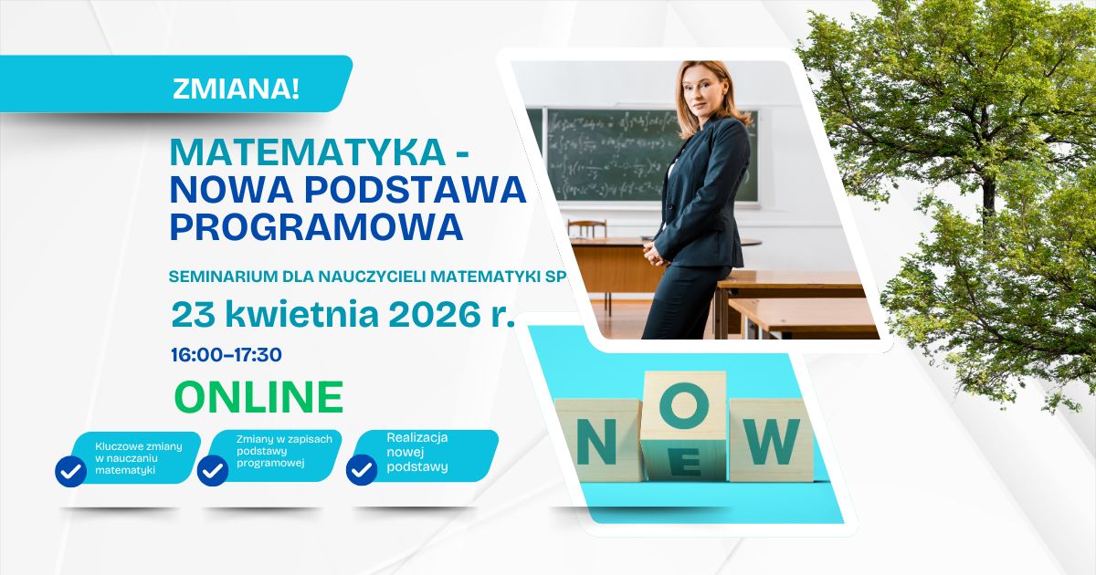 Podczas bezpłatnego seminarium ONLINE „ZMIANA W NAUCZANIU MATEMATYKI – WPROWADZENIE DO NOWEJ PODSTAWY PROGRAMOWEJ” omówimy najważniejsze zagadnienia związane z wdrażaniem nowej podstawy programowej. Spotkanie będzie okazją do zdobycia praktycznej wiedzy oraz inspiracji do pracy dydaktycznej.