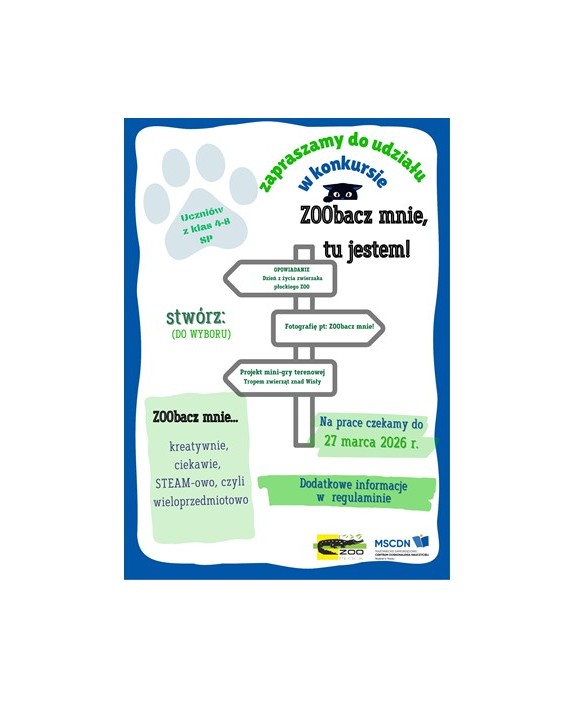 Kolejna – czwarta już edycja konkursu dla szkół realizowanego wspólnie z płockim ZOO – nosi tytuł ZOObacz mnie, tu jestem! Konkurs ten to świetna zabawa, nauka i okazja do wykazania się kreatywnością! Razem stwórzmy doskonałą okazję, aby rozwijać pasje, odkrywać fascynujący świat zwierząt i promować postawy odpowiedzialności oraz troski o środowisko.